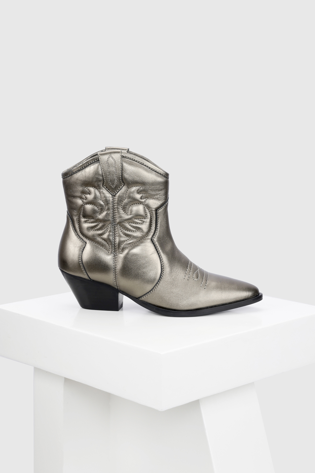 Carmen is a western ankle boot with a 45mm heel. This stable boot combines an intricately stitched design and fine leather for a balanced look. It is available in black as well as dull gold leather. All our boots are designed in Europe and manufactured using premium leather.